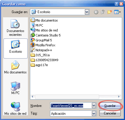 Al hacer click en el botón "Guardar" o "Guardar archivo", el navegador abrirá el cuadro de diálogo "Guardar como", mediante el cual se podrá elegir la carpeta del disco rígido en la que se desea realizar la descarga del archivo, como por ejemplo el Escritorio. Luego de seleccionar el directorio de destino, el usuario deberá hacer click en el botón "Guardar" para así dar inicio a la descarga: