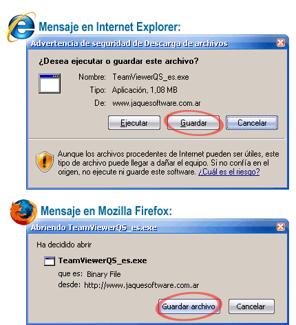 Al hacer click en el enlace de descarga, recibirá un mensaje diferente dependiendo del navegador que utilice. En cualquier caso, el usuario deberá hacer click en el botón "Guardar" o "Guardar archivo" mostrado aquí: