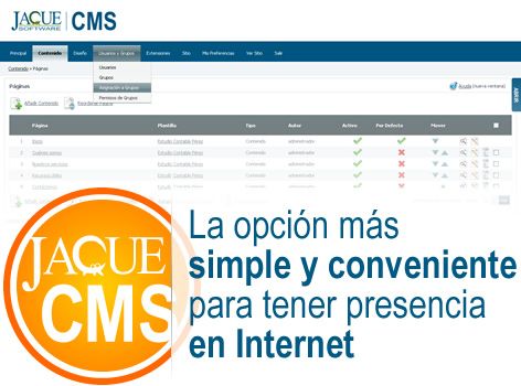 El sistema de administración de contenidos JAQUE CMS permite que el usuario pueda subir y actualizar las páginas de su sitio web por sí mismo, sin la necesidad de tener conocimientos de diseño de sitios web y utilizando solamente el navegador web de cualquier computadora con acceso a Internet.